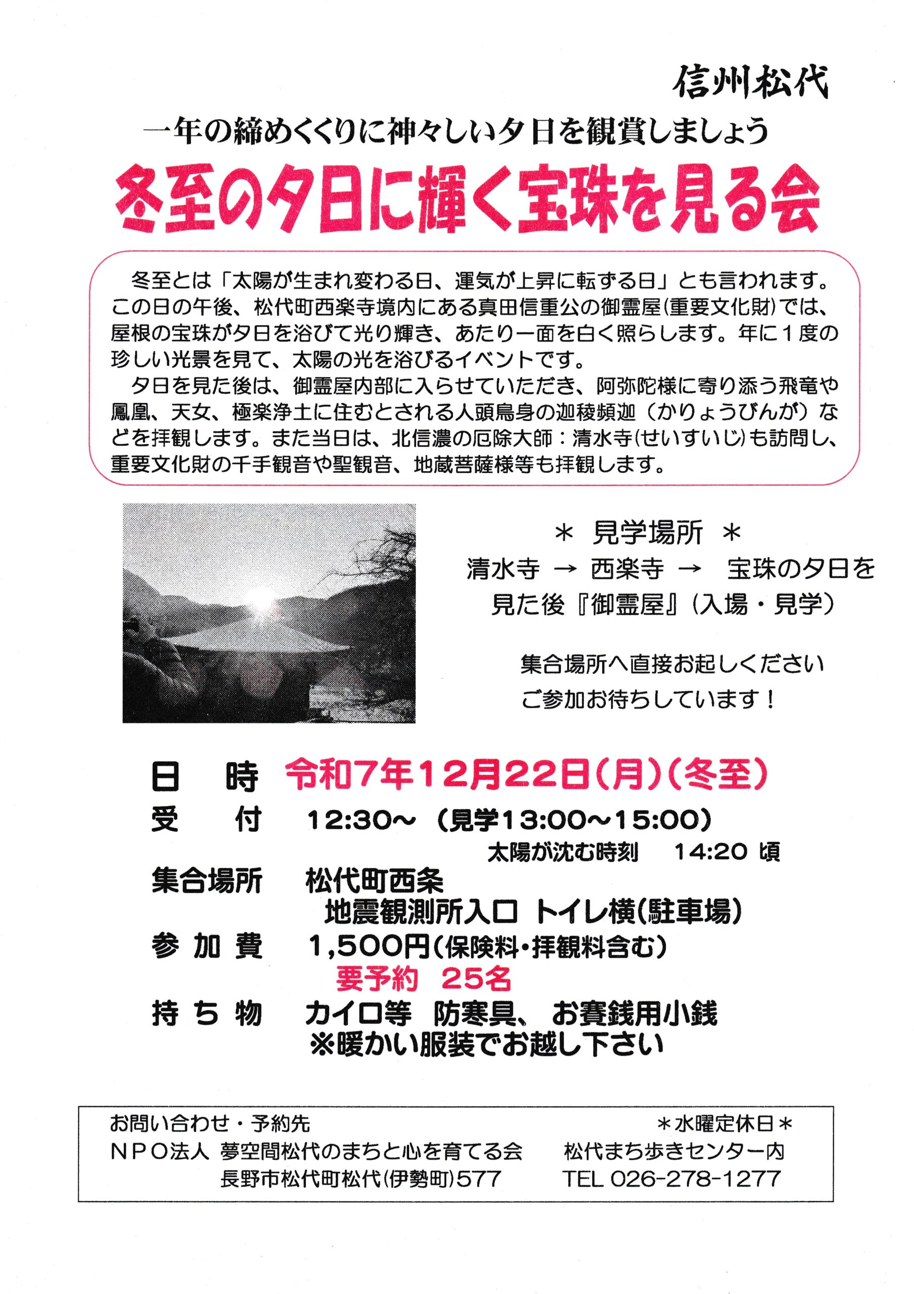 冬至とは「太陽が生まれ変わる日、運気が上昇に転ずる日」とも言われます。 この日の午後、松代町西楽寺境内にある真田信重公の御霊屋(重要文化財)では、 屋根の宝珠が夕日を浴びて光り輝き、あたり一面を白く照らします。年に1度の 珍しい光景を見て、太陽の光を浴びるイベントです。