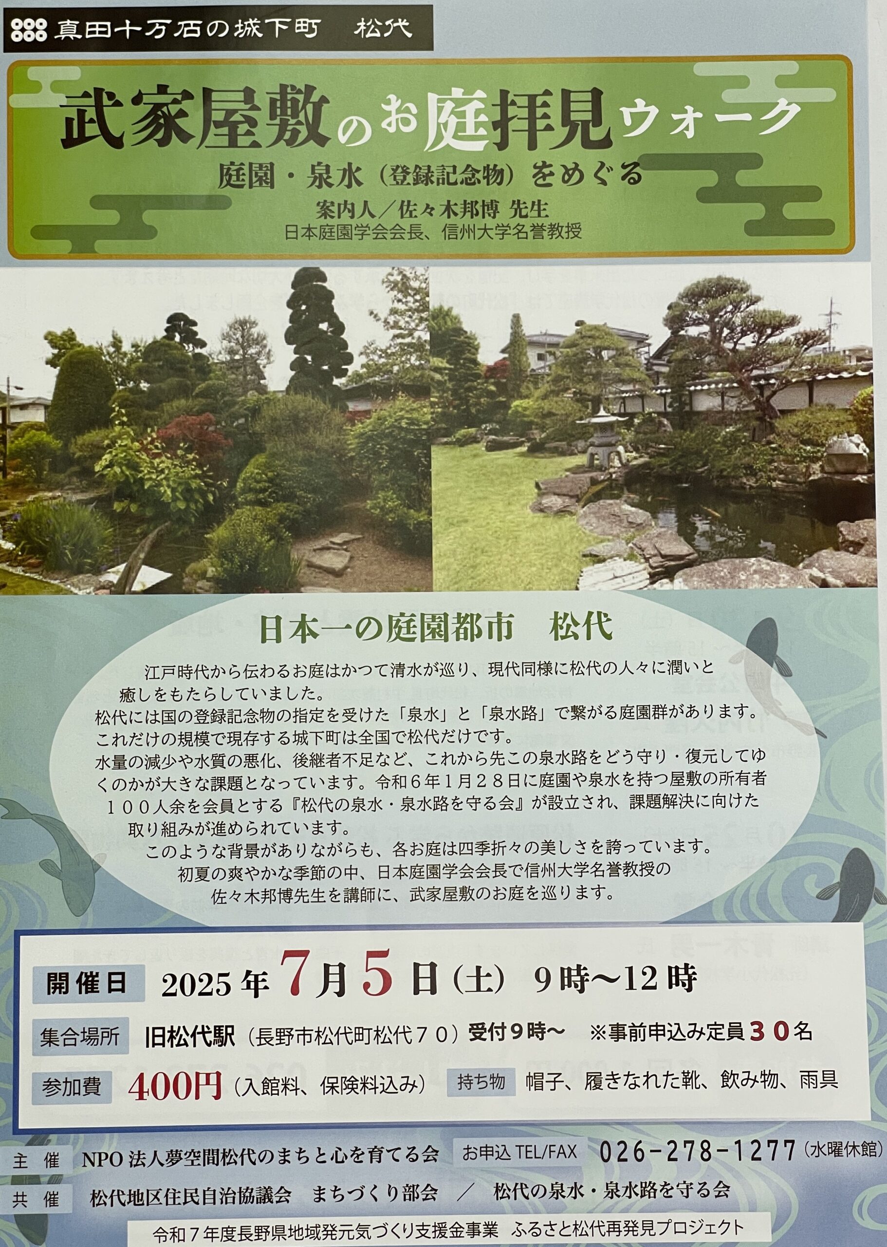 初夏の爽やかな季節の中、日本庭園学会会長で信州大学名誉教授の佐々木邦博先生を講師に、武家屋敷のお庭を巡ります。